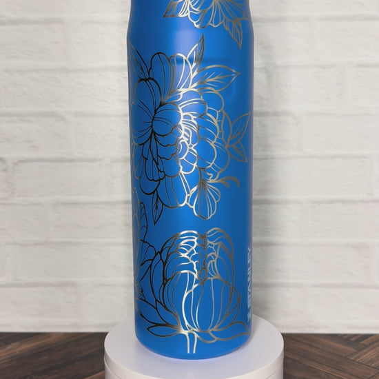 24 oz Stanley Iceflow tumbler laser engraved with a Peony design. Tumbler color is Azure blue.