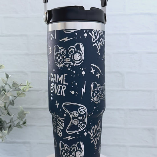 30 oz top handle, flip straw tumbler in Navy Blue with a laser engraved Space design.