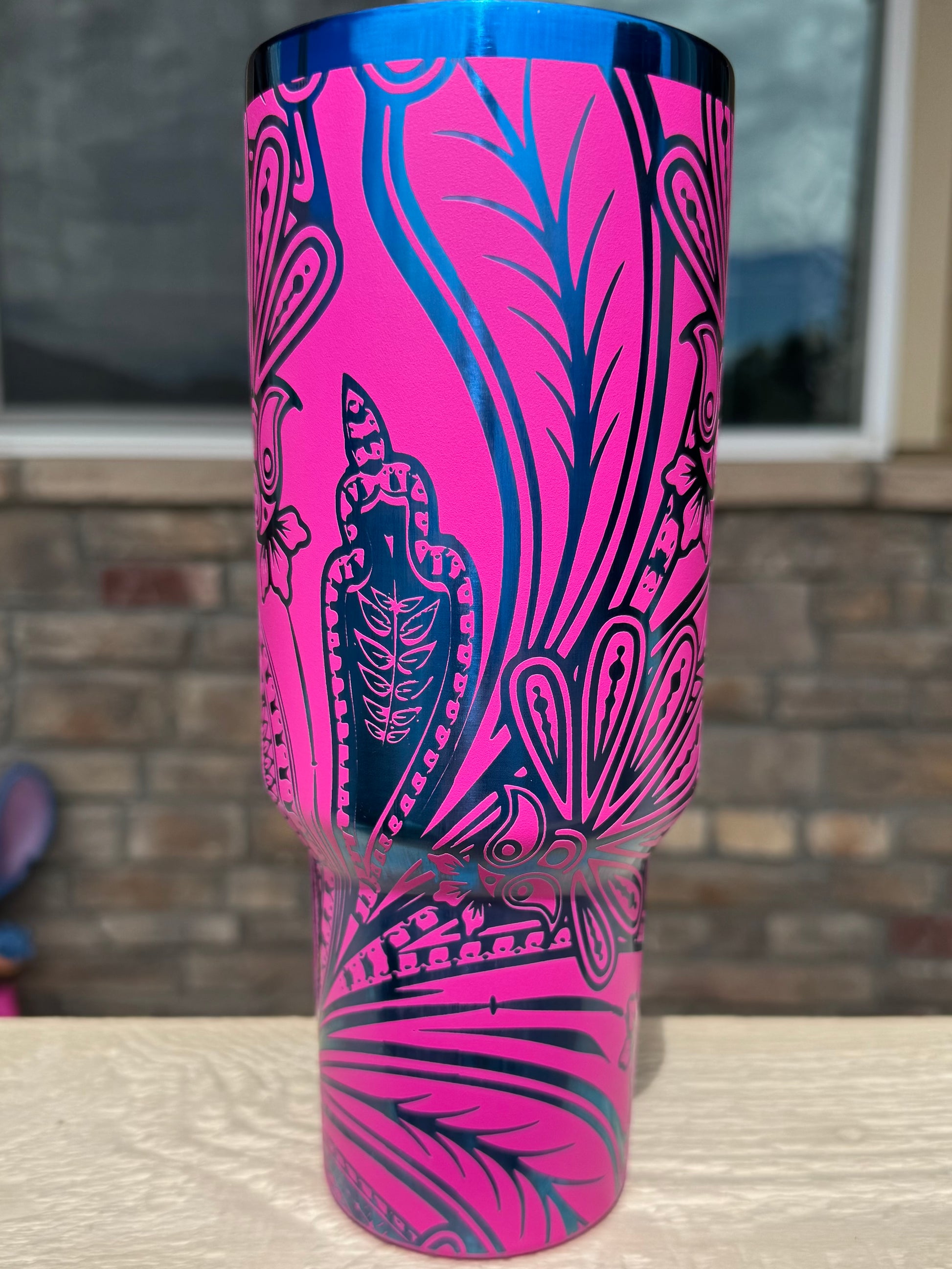 40 oz Tumbler - Floral Paisley on Hot Pink engraves Blue RTS